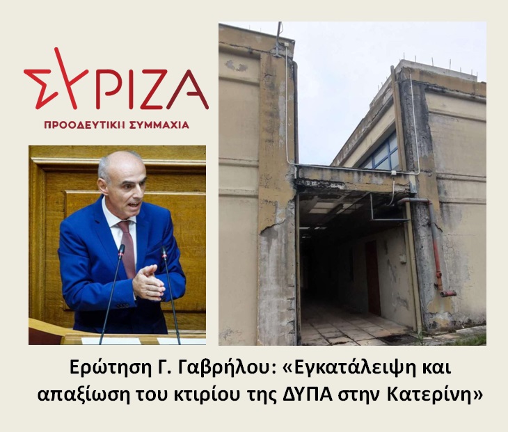 Θέμα: «Εγκατάλειψη και απαξίωση του κτιρίου της ΔΥΠΑ στην Κατερίνη»