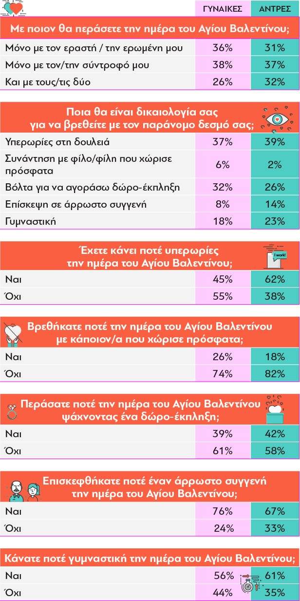 Η πιο δημοφιλής δικαιολογία των Ελλήνων για να ξεφύγουν από γλυκανάλατες καταστάσεις με τον/τη σύντροφό τους την ημέρα του Αγίου Βαλεντίνου είναι ότι πρέπει να κάνουν υπερωρίες στη δουλειά ‒αυτό δηλώνει το 37% των Ελληνίδων και το 39% των Ελλήνων. Πρόκειται για ιδανική δικαιολογία που δεν θα πληγώσει το ταίρι τους. Στην πραγματικότητα ενδέχεται ακόμα και να εισπράξουν οίκτο, με αποτέλεσμα οι άπιστοι να έχουν το ελεύθερο να το σκάσουν και να περάσουν λίγο ποιοτικό χρόνο με τον παράνομο δεσμό τους χωρίς να υποστούν ανάκριση, γκρίνια κτλ. Στην πραγματικότητα, μόλις το 45% των γυναικών και το 62% των αντρών έχει χρειαστεί πραγματικά να κάνουν υπερωρίες το παρελθόν την ημέρα του Αγίου Βαλεντίνου.