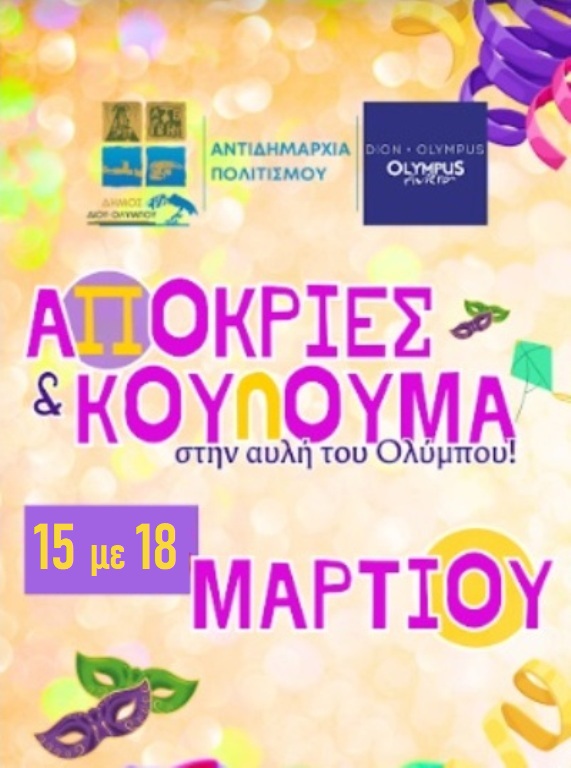 10:00 • Παραδοσιακά «κούλουμα» με μουσική, χορό και σαρακοστιανά εδέσματα από τον Σύλλογο Σαρακατσαναίων Νομού Πιερίας «Ο Κατσαντώνης», στο χώρο του παραδοσιακού οικισμού του Συλλόγου στο Δίον.