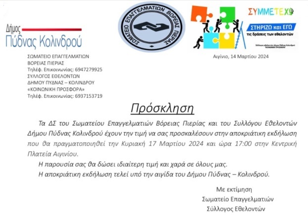 Το Σωματείο Επαγγελματιών Β. Πιερίας και ο Σύλλογος Εθελοντών Δήμου διοργανώνουν, υπό την αιγίδα του Δήμου Πύδνας-Κολινδρού,