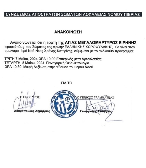 Η εορτή της ΑΓΙΑΣ ΜΕΓΑΛΟΜΑΡΤΥΡΟΣ ΕΙΡΗΝΗΣ προστάτιδας του Σώματος της πρώην ΕΛΛΗΝΙΚΗΣ ΧΩΡΟΦΥΛΑΚΗΣ, θα γίνει στον ομώνυμο Ιερό Ναό Νέας Χράνης-Κατερίνης, σύμφωνα με το ακόλουθο πρόγραμμα: