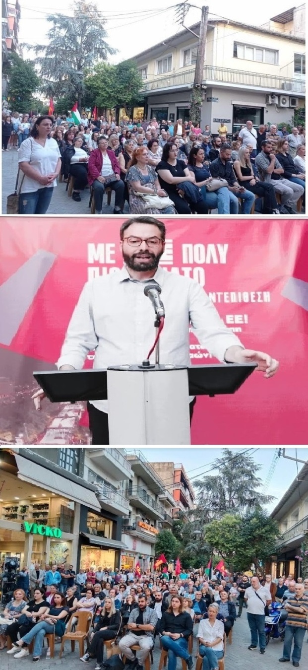 Και το στοίχημα είναι εάν οι εργαζόμενοι, οι υπάλληλοι, οι βιοπαλαιστές αγρότες κτηνοτρόφοι της Κατερίνης, της Πιερίας θα συναντηθούν με όλους εκείνους που λένε "φτάνει, ως εδώ". "Φτάνει ως εδώ" στους λίγους, στους μεγαλοεπιχειρηματίες, στους μεγαλοαγρότες, στους μεγαλοξενοδόχους, στα μεγάλα συμφέροντα κι εκείνους που τα υπηρετούν: Τη ΝΔ, τον ΣΥΡΙΖΑ, το ΠΑΣΟΚ, την Ελληνική Λύση και τα υπόλοιπα κόμματα της ΕΕ».