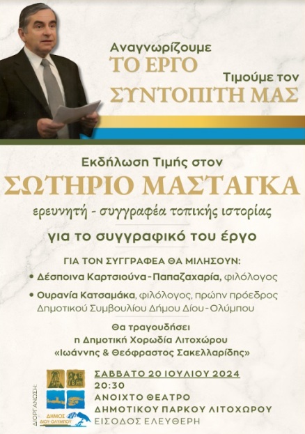 Στην τιμητική εκδήλωση του Σαββάτου 20 Ιουλίου θα μιλήσουν για τον συγγραφέα η κυρία Δέσποινα Καρτσιούνα-Παπαζαχαρία, φιλόλογος και η κυρία Ουρανία Κατσαμάκα, φιλόλογος, πρώην πρόεδρος του Δημοτικού Συμβουλίου Δήμου Δίου-Ολύμπου.