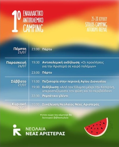 Μετά από μια «γεμάτη» χρονιά, διοργανώνουμε το 1΄ εναλλακτικό αντιπολεμικό camping της Νεολαίας της Νέας Αριστεράς.