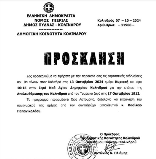 Σας προσκαλούμε να τιμήσετε με την παρουσία σας τις εορταστικές εκδηλώσεις που θα γίνουν στον Κολινδρό στις 13 Οκτωβρίου 2024 ημέρα Κυριακή και ώρα 10:15 στον Ιερό Ναό Αγίου Δημητρίου Κολινδρού για την επέτειο της Απελευθέρωσης του Κολινδρού από τον Τουρκικό ζυγό στις 17 Οκτωβρίου 1912.