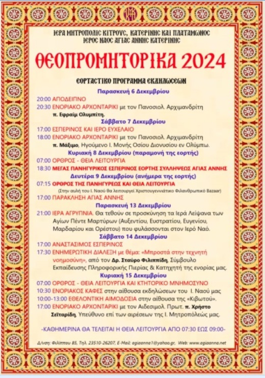 Οι φετινές εκδηλώσεις, που πραγματοποιούνται με τις ευλογίες και την πατρική μέριμνα του Σεβασμιωτάτου Μητροπολίτη κ Γεωργίου, θα ξεκινήσουν την Παρασκευή 6 Δεκεμβρίου και θα ολοκληρωθούν την Κυριακή 15 Δεκεμβρίου σύμφωνα με το αναλυτικό πρόγραμμα που επισυνάπτεται.