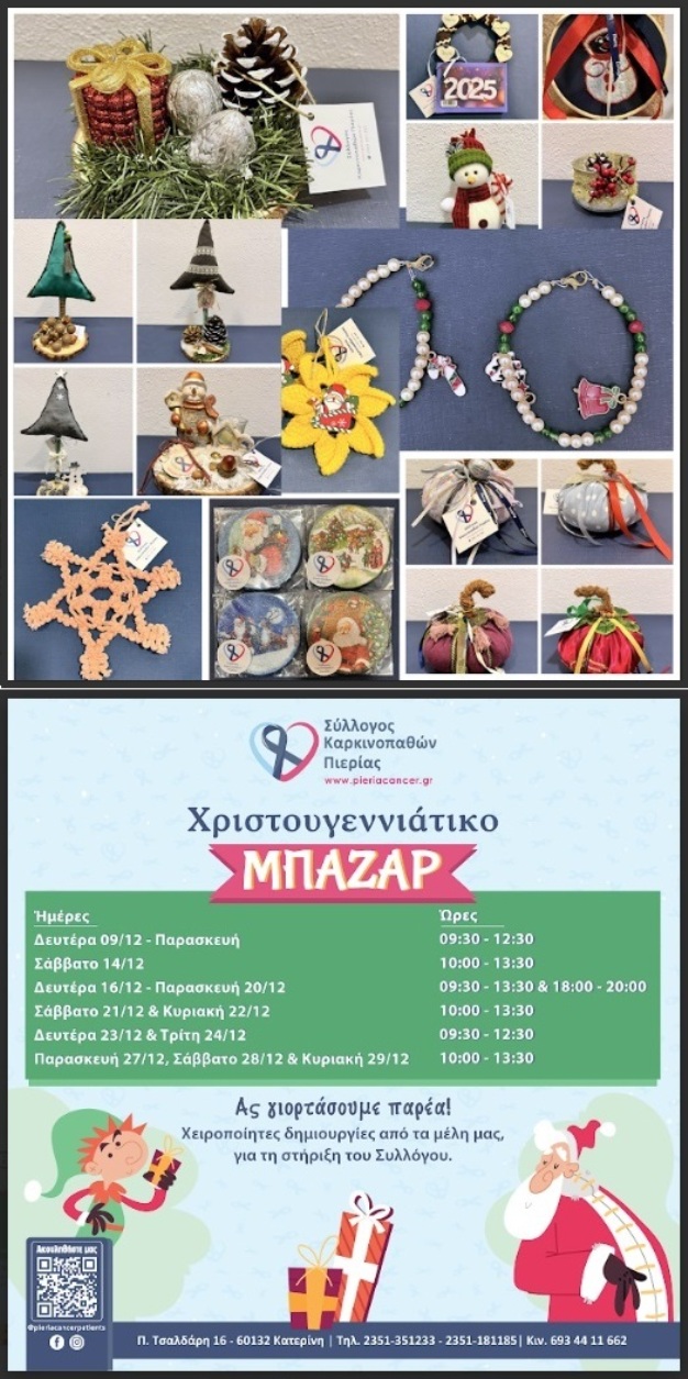 Ο Σύλλογος Καρκινοπαθών Πιερίας με αίσθημα αλληλεγγύης και ανθρωπιάς, διοργανώνει Χριστουγεννιάτικο Μπαζάρ χειροποίητων κατασκευών.