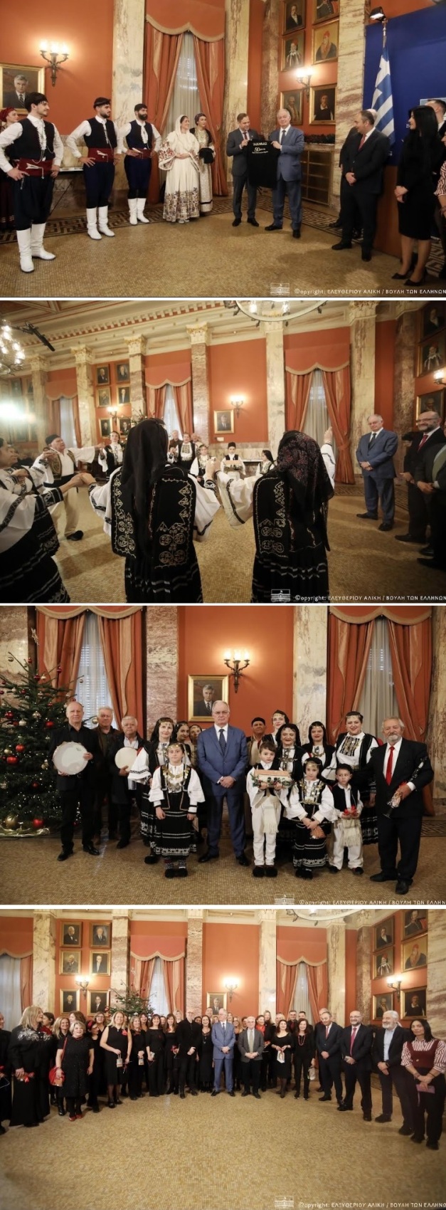 Ο Πρόεδρος της Βουλής των Ελλήνων, κ. Κωνσταντίνος Τασούλας, υποδέχθηκε στον χώρο του Εντευκτηρίου παιδιά από το Νηπιαγωγείο της Βουλής, τον Όμιλο Βρακοφόρων Κρήτης, το Κέντρο Ειδικών Ατόμων η «Χαρά», τη Χορωδία του Συλλόγου των Υπαλλήλων της Βουλής, το Λύκειο των Ελληνίδων και τον Πολιτιστικό Σύλλογο Ηπειρωτών Βριλησσίων «Ο Πύρρος», που τραγούδησαν παραδοσιακά κάλαντα από την Κρήτη, την Ήπειρο, την Θράκη και τα ελληνικά νησιά.