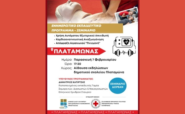 Το 5ο - σε σύνολο 12 - δωρεάν ενημερωτικό-εκπαιδευτικό σεμινάριο χρήσης απινιδωτή, απόφραξης αεραγωγού «Πνιγμονή» και καρδιοαναπνευστικής αναζωογόνησης θα πραγματοποιηθεί την Παρασκευή 7 Φεβρουαρίου 2025 στην αίθουσα εκδηλώσεων του δημοτικού σχολείου Πλαταμώνα, στις 5:30 το απόγευμα.