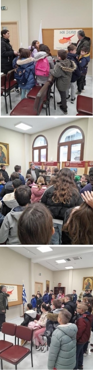 Τα παιδιά ενημερώθηκαν από την Πρόεδρο του Συλλόγου Κυπρίων Πιερίας κα Αιμιλία Ζαχαριάδου και τον επιμελητή της έκθεσης κ. Χαράλαμπο Πενλίδη με ξεναγήσεις, φωτογραφίες και οπτικοακουστικό υλικό για την καταστροφή της πολιτιστικής κληρονομιάς της Κύπρου από το 1974 έως σήμερα από τις τουρκικές δυνάμεις εισβολής και κατοχής.