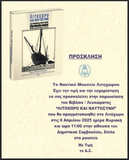 Το Ναυτικό Μουσείο Λιτοχώρου έχει την τιμή και την ευχαρίστηση να σας προσκαλέσει στην παρουσίαση του Βιβλίου - Λευκώματος -Λιτόχωρο και Ναυτοσύνη-,που θα πραγματοποιηθεί στο Λιτόχωρο,