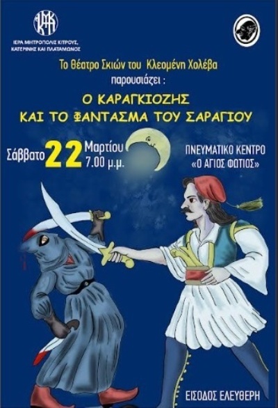 Στο Πνευματικό Κέντρο ''Ο ΑΓΙΟΣ ΦΩΤΙΟΣ'' της Ιεράς Μητροπόλεως Κίτρους  -  Πιερίας , σήμερα  22 Μαρτίου 2025  - Θέατρο Σκιών  του Κλεομένη Χολέβα , για μικρούς και μεγάλους .
