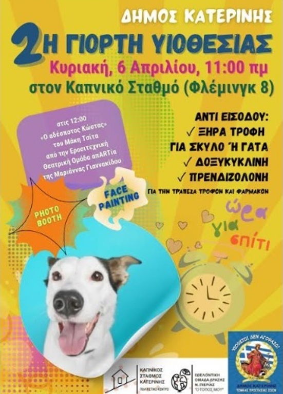Με αφορμή την Παγκόσμια Ημέρα Αδέσποτων Ζώων, ο Δήμος Κατερίνης διοργανώνει την Κυριακή 06 Απριλίου, στις 11:00 π.μ. στον Καπνικό Σταθμό, τη 2η γιορτή υιοθεσίας-ΥΙΟΘΕΤΩ! ΔΕΝ ΑΓΟΡΑΖΩ!-