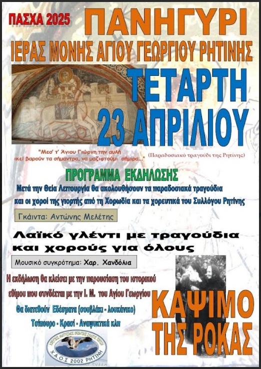 Την Τετάρτη 23 Απριλίου 2025, η Ιερά Μονή θα υποδεχτεί πιστούς και επισκέπτες και οι Ρητινιώτες θα τιμήσουν τον προστάτη τους Άγιο με τα καθιερωμένα έθιμά τους.