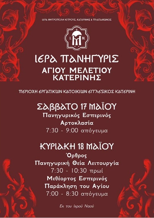 2) Την Κυριακή 18 Μαΐου 7:30 με 10:15 το πρωί η Πανηγυρική Θεία Λειτουργία και το απόγευμα της ίδιας ημέρας στις 7:00 ο Μεθέορτος εσπερινός και η Παράκληση του Αγίου Μελετίου.