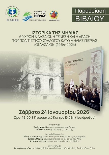 Στη διάρκεια της συνάντησης του Δημάρχου Κατερίνης, Ιωάννη Ντούμου, με την πρόεδρο του Δ.Σ. του συλλόγου Κ. Μηλιάς, Γεωργία Αγγελάκη και εν όψει της επίσημης παρουσίασης του βιβλίου: «ΙΣΤΟΡΙΚΑ ΤΗΣ ΜΗΛΙΑΣ. 60 ΧΡΟΝΙΑ ΛΑΖΑΙΟΙ. Η ΓΕΝΕΣΗ ΚΑΙ Η ΔΡΑΣΗ ΤΟΥ ΠΟΛΙΤΙΣΤΙΚΟΥ ΣΥΛΛΟΓΟΥ ΚΑΤΩ ΜΗΛΙΑΣ ΠΙΕΡΙΑΣ «ΟΙ ΛΑΖΑΙΟΙ» 1964 -2024», συζητήθηκε η προσεγμένη αυτή έκδοση που αποτυπώνει την ιστορική και πολιτισμική διαδρομή της Μηλιάς.