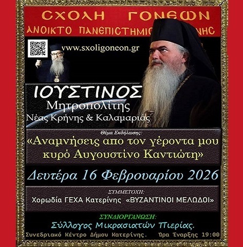 Ο σεβασμιώτατος θα αναφερθεί στον γέροντα του π. Αυγουστίνο Καντιώτη (1907-2010), ο οποίος ήταν διακεκριμένος Έλληνας επίσκοπος, Μητροπολίτης Φλωρίνης, Πρεσπών και Εορδαίας για πολλά χρόνια (1967-2000), γνωστός για την έντονη ποιμαντική του δράση, τις ομιλίες και τα συγγράμματά του.