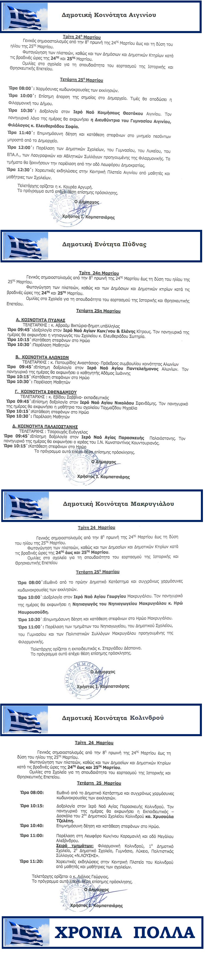 ΔΗΜΟΣ ΠΥΔΝΑΣ - ΚΟΛΙΝΔΡΟΥ: Προγράμματα εορτασμού της Εθνικής Επετείου της 25ης Μαρτίου 1821 ανά Κοινότητα