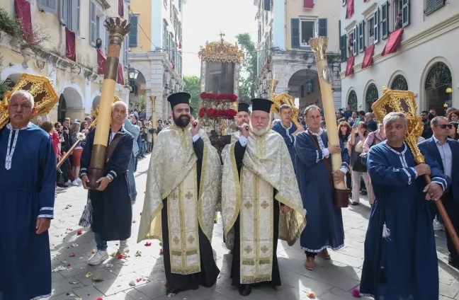 Έτσι οι Κερκυραίοι από τότε βγάζουν τον Επιτάφιο της εκκλησίας του Αγίου Σπυρίδωνος μαζί με το Σεπτό Σκήνωμα του Αγίου, που στη συγκεκριμένη λιτανεία ο Άγιος έχει θέση χοροστατούντος Επισκόπου και πίσω ακολουθεί ο Επιτάφιος.