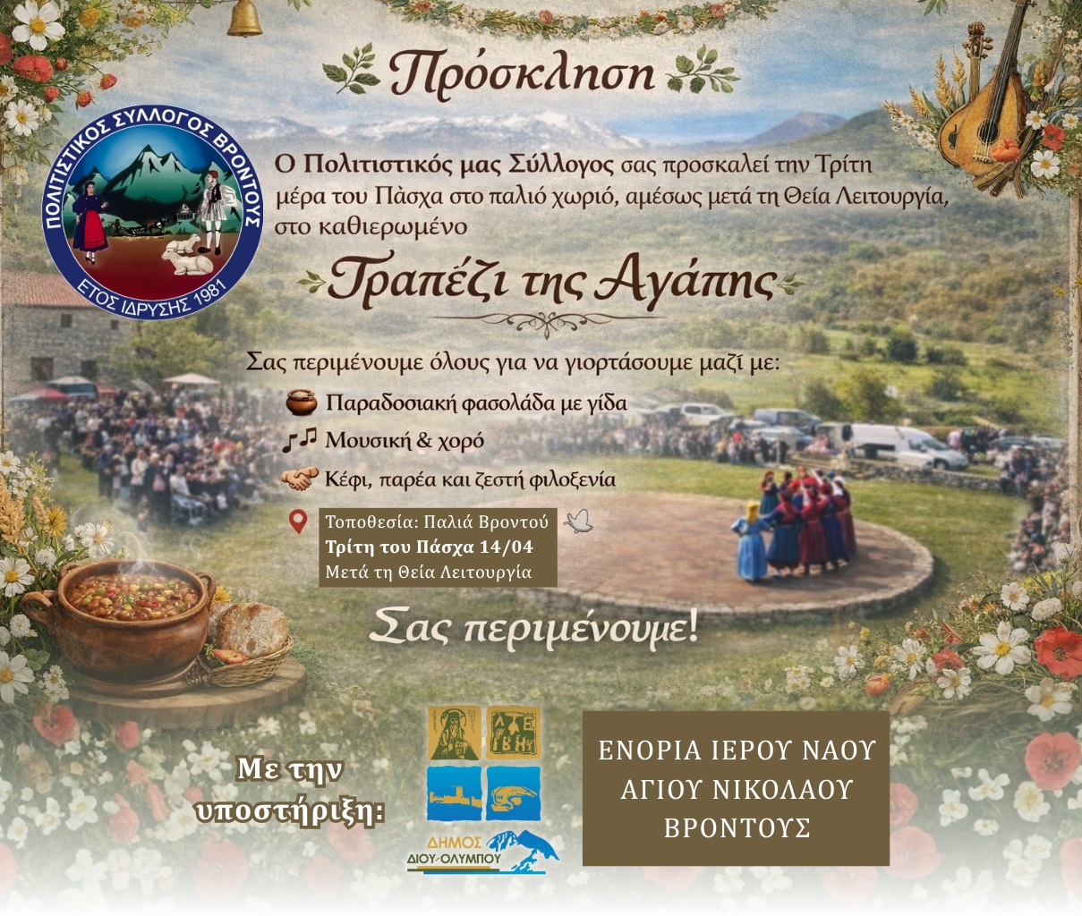 Σας περιμένουμε στην πασχαλινή εκδήλωση "Τραπέζι της Αγάπης" του Πολιτιστικού Συλλόγου Βροντούς, που θα διοργανωθεί την Τρίτη του Πάσχα -14 Απριλίου 2026- στην Παλιά Βροντού, μετά τη Θεία Λειτουργία, με την υποστήριξη του Δήμου Δίου-Ολύμπου και της Ενορίας του Ιερού Ναού Αγίου Νικολάου Βροντούς.