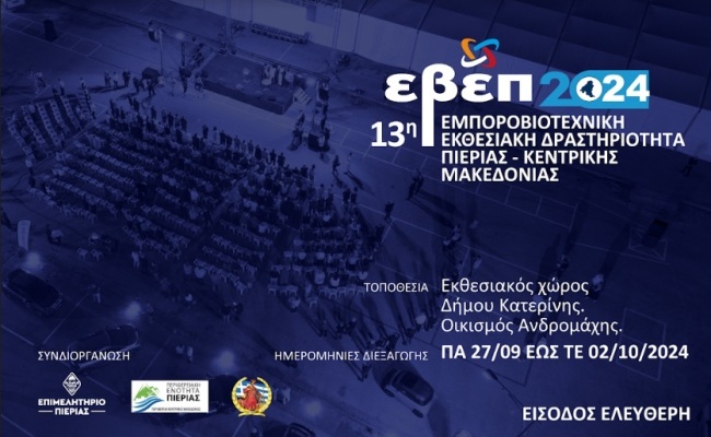Η 13η Εμποροβιοτεχνική Εκθεσιακή Δραστηριότητα Πιερίας – Κεντρικής Μακεδονίας 2024 (13η ΕΒΕΠ-ΚΜ 2024), θα διεξαχθεί από Παρασκευή 27 Σεπτεμβρίου έως και Τετάρτη 02 Οκτωβρίου 2024, στις εγκαταστάσεις του Δήμου Κατερίνης, στον Οικισμό Ανδρομάχης, με συνδιοργανωτές την Π.Ε. Πιερίας και το Δήμο Κατερίνης.
