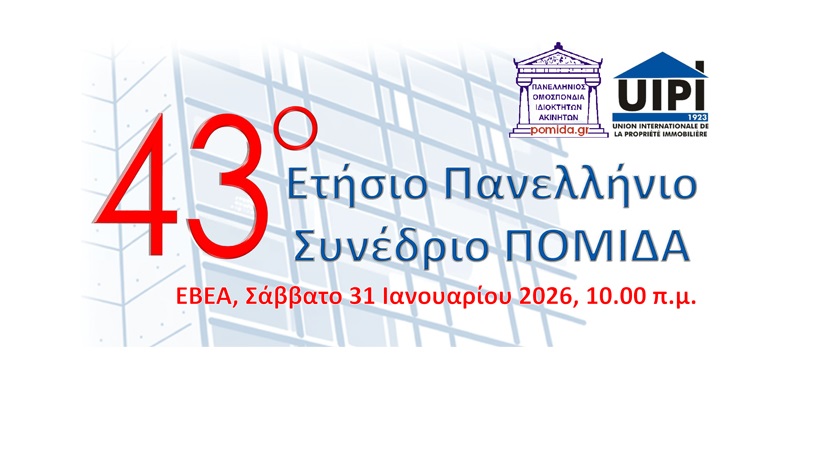 Η ετήσια γενική συνέλευση της ΠΟΜΙΔΑ θα πραγματοποιηθεί το Σάββατο 31 Ιανουαρίου στο ΕΒΕΑ, με αντικείμενο όλα τα τρέχοντα προβλήματα που αντιμετωπίζουν οι ιδιοκτήτες ακινήτων.