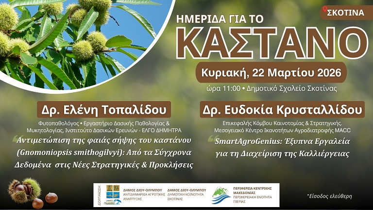 Η Αντιδημαρχία Αγροτικής Ανάπτυξης του Δήμου Δίου-Ολύμπου σας προσκαλεί στην ενημερωτική ημερίδα για τις παθήσεις και τη διαχείριση των καστανοκαλλιεργειών, την Κυριακή 22 Μαρτίου 2026 (ώρα 11:00) στην αίθουσα εκδηλώσεων του Δημοτικού Σχολείου Σκοτίνας.