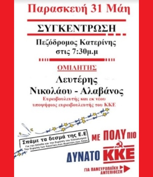 Όλοι στη συγκέντρωση του ΚΚΕ, την Παρασκευή 31 Μάη, στις 7:30μ.μ στον Πεζόδρομο Κατερίνης.
