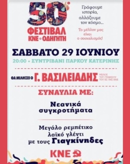 Καλούμε τους νέους και τις νέες της Κατερίνης κι όλης της Πιερίας, να παρευρεθούν στις εκδηλώσεις του 50ου Φεστιβάλ ΚΝΕ - ΟΔΗΓΗΤΗ, το Σάββατο 29 Ιούνη και ώρα 8:30μμ στο Σιντριβάνι του Πάρκου Κατερίνης.