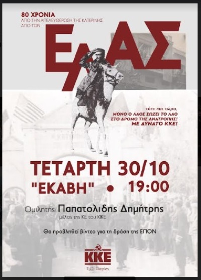 Κορύφωση των δράσεων που πραγματοποιήθηκαν τις προηγούμενες μέρες με αφορμή τα 80 χρόνια από την απελευθέρωση της Κατερίνης από τον ΕΛΑΣ, θα αποτελέσει η εκδήλωση της ΤΕ Πιερίας του ΚΚΕ, την Τετάρτη 30 Οκτώβρη στην "ΕΚΑΒΗ", στις 7 μ.μ., με ομιλητή τον Δημήτρη Παπατολίδη, μέλος της ΚΕ του ΚΚΕ. Τίτλος της εκδήλωσης «Τότε και τώρα, μόνο ο λαός σώζει το λαό στο δρόμο της ανατροπής! Με δυνατό ΚΚΕ!»