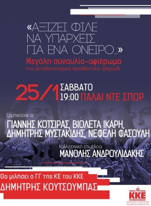 Θα ακολουθήσει μεγάλη συναυλία – αφιέρωμα στο μεταδικτατορικό, προοδευτικό τραγούδι με τίτλο : «Αξίζει φίλε να υπάρχεις για ένα όνειρο…». Τραγουδούν οι: Γιάννης Κοτσιρας, Βιολέτα Ίκαρη, Δημήτρης Μυστακίδης, Νεφέλη Φασουλή.