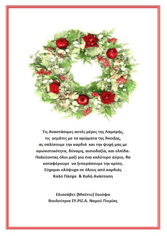 Ευχές για το Πάσχα της Ελισσάβετ-Μπέττυ Σκούφα  Βουλεύτρια ΣΥΡΙΖΑ νομού Πιερίας