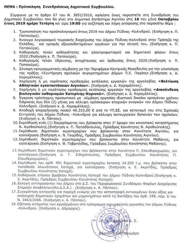 AIGINIONEWS: Συνεδρίαση του Δημοτικού Συμβουλίου του Δήμου Πύδνας -Κολινδρού -Τετάρτη 16 Οκτωβρίου 2019 και ώρα 19:00 AIGINIONEWS: Συνεδρίαση του Δημοτικού Συμβουλίου του Δήμου Πύδνας -Κολινδρού -Τετάρτη 16 Οκτωβρίου 2019 και ώρα 19:00