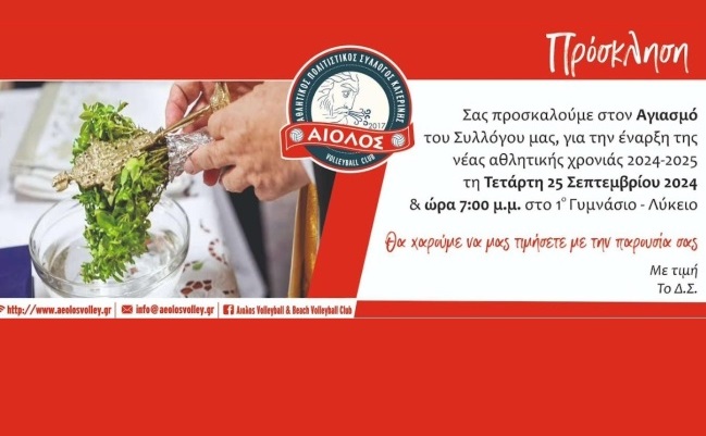 Ο Αθλητικός και Πολιτιστικός Σύλλογος Κατερίνης "Αίολος" σας προσκαλεί στον Αγιασμό που θα γίνει για την έναρξη της νέας Αθλητικής Χρονιάς 2024-2025.