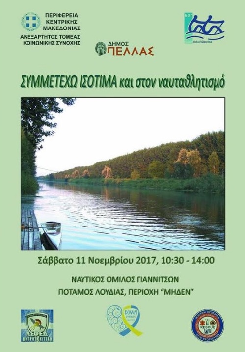 Η Περιφέρεια Κεντρικής Μακεδονίας και ο Τομέας Κοινωνικής Συνοχής διοργανώνουν δράση ναυταθλητισμού για άτομα με σύνδρομο Down στον ποταμό Λουδία (Ναυτικός Όμιλος Γιαννιτσών, ποταμός Λουδίας, θέση «Μηδέν»), που θα πραγματοποιηθεί το Σάββατο 11 Νοεμβρίου 2017, από τις 10 το πρωί ως τις 2 το μεσημέρι, στο πλαίσιο της δράσης «Συμμετέχω Ισότιμα». Η δράση πραγματοποιείται σε συνεργασία με το Δήμο Πέλλας και με την υποστήριξη του Ναυτικού Ομίλου Γιαννιτσών, της Λέσχης Εφέδρων Ενόπλων Δυνάμεων, της Επίλεκτης Ομάδας Ειδικών Αποστολών Πυλαίας-Χορτιάτη και της εταιρίας «Ελληνικά Πετρέλαια».