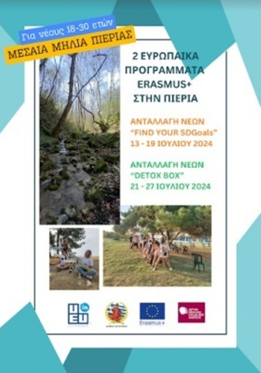 Η 2η Ανταλλαγή Νέων “Detox Box” που θα διεξαχθεί από τις 21-27 Ιουλίου, έχει ως θέμα την αποτοξίνωση από τον ψηφιακό κόσμο και την ευκαιρία να έρθουμε πιο κοντά μέσα από απλές αλλά πολύτιμες μορφές επικοινωνίας όπως τα παιχνίδια, το θέατρο, το storytelling, η επαφή με τη φύση κλπ. (Συμμετέχουσες χώρες Ιταλία, Σλοβακία, Ρουμανία, Ελλάδα)