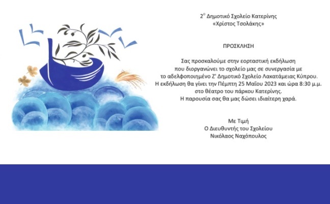 Το 2΄ Δημοτικό Σχολείο Κατερίνης -"Χρίστος Τσολάκης" σας προσκαλεί σε εορταστική εκδήλωση την Πέμπτη 25/5/2023 και ώρα 8:30 μ.μ. στο θέατρο του πάρκου Κατερίνης.