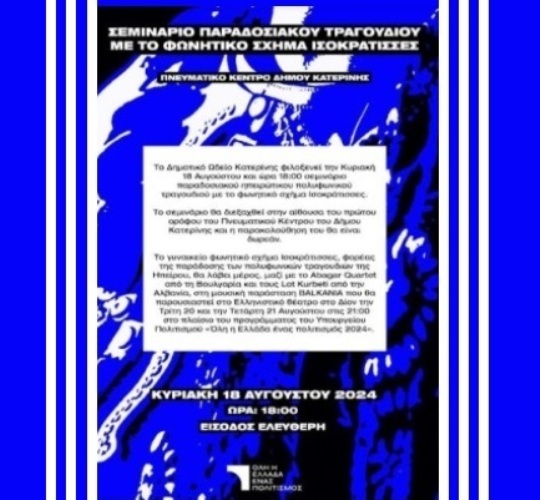 Επίσης, το σεμινάριο διοργανώνεται και σε συνάρτηση με τη μουσική παράσταση BALKANIA που φιλοξενεί τρία φωνητικά σύνολα προσκεκλημένα από τη WOMO και τις CHÓRES (Ισοκράτισσες από την Ελλάδα, Lot Kurbeti από την Αλβανία και Abagar Quartet από τη Βουλγαρία) και θα λάβει χώρα στο αρχαίο θέατρο του Δίου, στις 20 και 21 Αυγούστου στις 21.00, στο πλαίσιο του προγράμματος 2024 του θεσμού του Υπουργείου Πολιτισμού «Όλη η Ελλάδα ένας πολιτισμός».Η συμμετοχή στο σεμινάριο είναι δωρεάν.