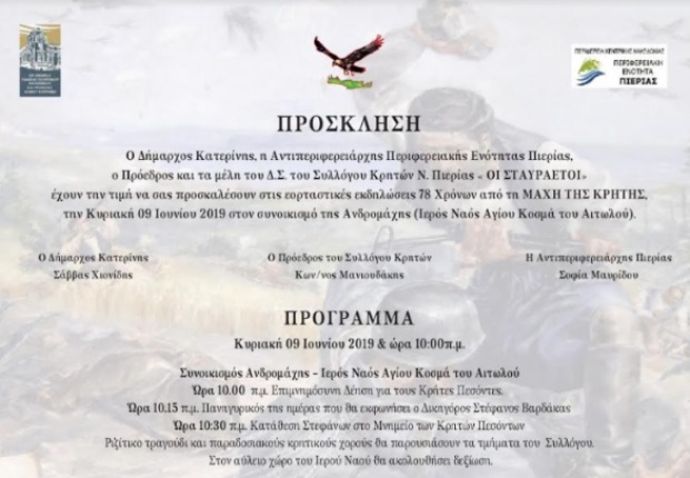 Ο Σύλλογος Κρητών Πιερίας < ΟΙ  ΣΤΑΥΡΑΕΤΟΙ > σας προσκαλούν την Κυριακή 9 Ιουνίου 2019  και ώρα 10 π.μ. στις εκδηλώσεις για τα 78 ΧΡΟΝΙΑ  ΑΠΟ ΤΗΝ ΜΑΧΗ ΤΗΣ ΚΡΗΤΗΣ στον συνοικισμό Ανδρομάχη  στην Κατερίνη.