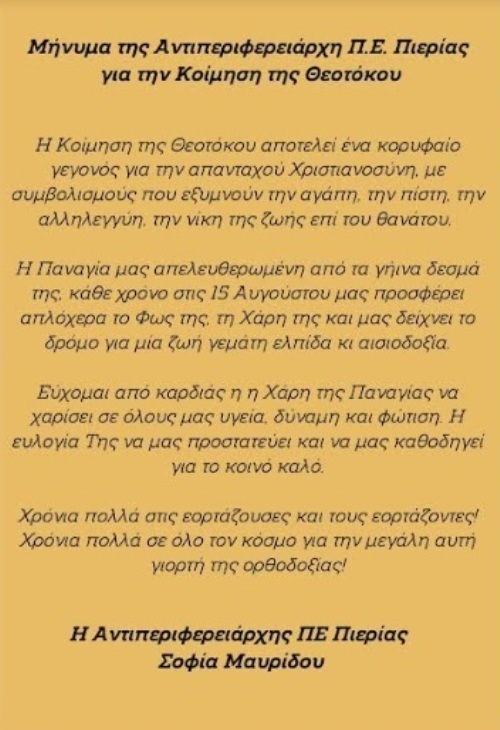ΜΗΝΥΜΑ ΤΗΣ ΑΝΤΙΠΕΡΙΦΕΡΕΙΑΡΧΗ Π.Ε.ΠΙΕΡΙΑΣ ΓΙΑ ΤΗΝ ΚΟΙΜΗΣΗ ΤΗΣ ΘΕΟΤΟΚΟΥ