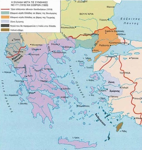 Η αμέσως επόμενη εδαφική επέκταση αφορά την Ελλάδα των δύο ηπείρων και των πέντε θαλασσών που δρομολογήθηκε με τη συνθήκη των Σεβρών.