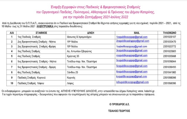 Έναρξη Εγγραφών στους Παιδικούς & Βρεφονηπιακούς Σταθμούς του Ο.Π.Π.Α.Π. του Δήμου Κατερίνης