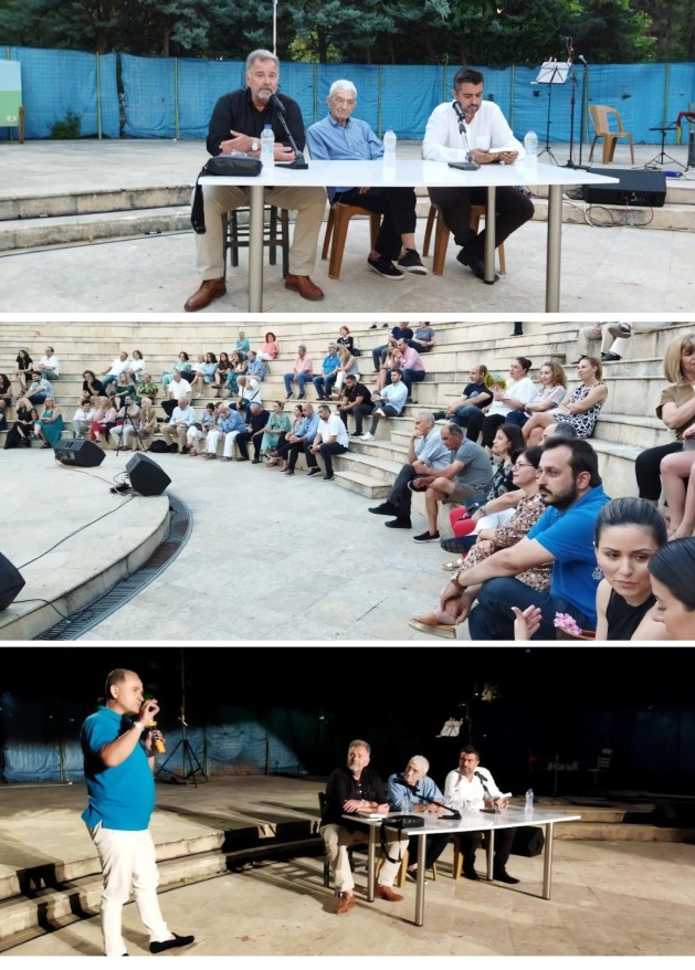 Στην ενταγμένη στο πρόγραμμα των καλοκαιρινών εκδηλώσεων του Οργανισμού Πολιτισμού του Δήμου & της Εστίας Πιερίδων Μουσών παρουσίαση, τον συγγραφέα “ανέκριναν” στο θέατρο πάρκου, ο αντιδήμαρχος δόμησης Γιώργος Νταντάμης και ο Διονύσης Ζαρώτης, έφορος λόγου και τέχνης της Εστίας Πιερίδων Μουσών.
