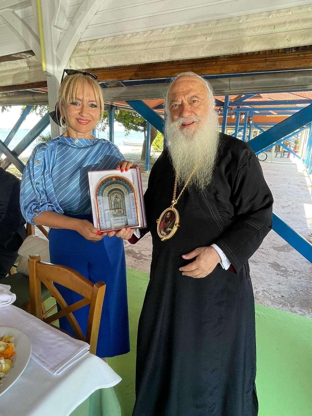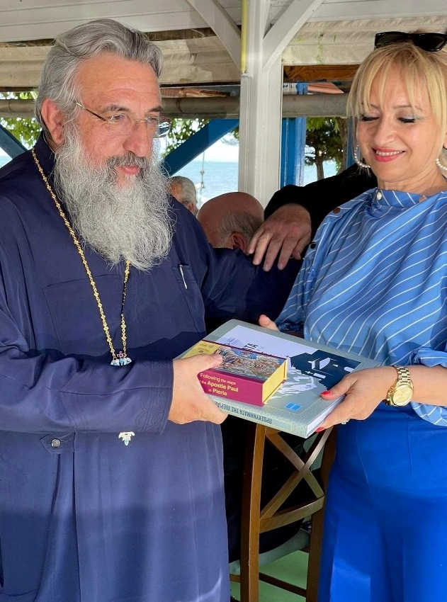 Η Αντιπεριφερειάρχης προσέφερε στο Σεβασμιώτατο Αρχιεπίσκοπο Κρήτης κ.κ. Ευγένιο το νεοεκδοθέν ιστορικό-φωτογραφικό λεύκωμα με τα Προσκυνήματα της Πιερίας, ενώ παράλληλα δέχθηκε από τον Σεβασμιώτατο Μητροπολίτη Βεροίας κ. Παντελεήμονα, το αναμνηστικό της φετινής διοργάνωσης των ''Παυλείων''.