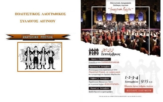 Ο Σύλλογος "ΑΝΑΤΟΛΙΚΗ ΡΩΜΥΛΙΑ" Αιγινίου σας παρουσιάζει το φετινό πρόγραμμα των εκδηλώσεών του, που έχουν γίνει σημείο αναφοράς για τους Αιγινιώτες και τους φίλους του Συλλόγου μας, κατά τη διάρκεια του Σεπτεμβρίου.