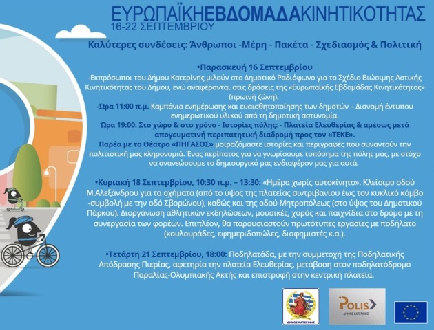 AIGINIONEWS:Ο Δήμος Κατερίνης στην «Ευρωπαϊκή Εβδομάδα Κινητικότητας» 16-22 Σεπτεμβρίου 2022 AIGINIONEWS:Ο Δήμος Κατερίνης στην «Ευρωπαϊκή Εβδομάδα Κινητικότητας» 16-22 Σεπτεμβρίου 2022