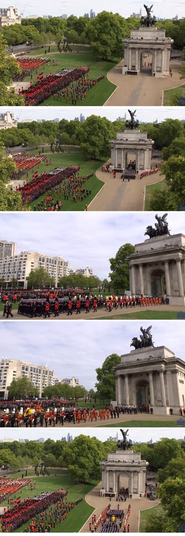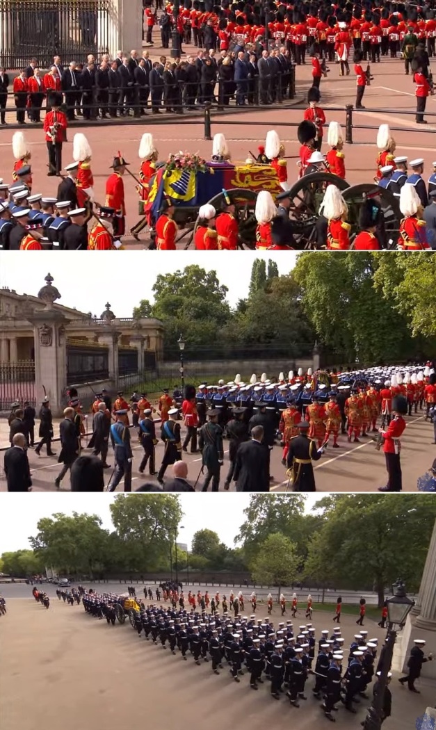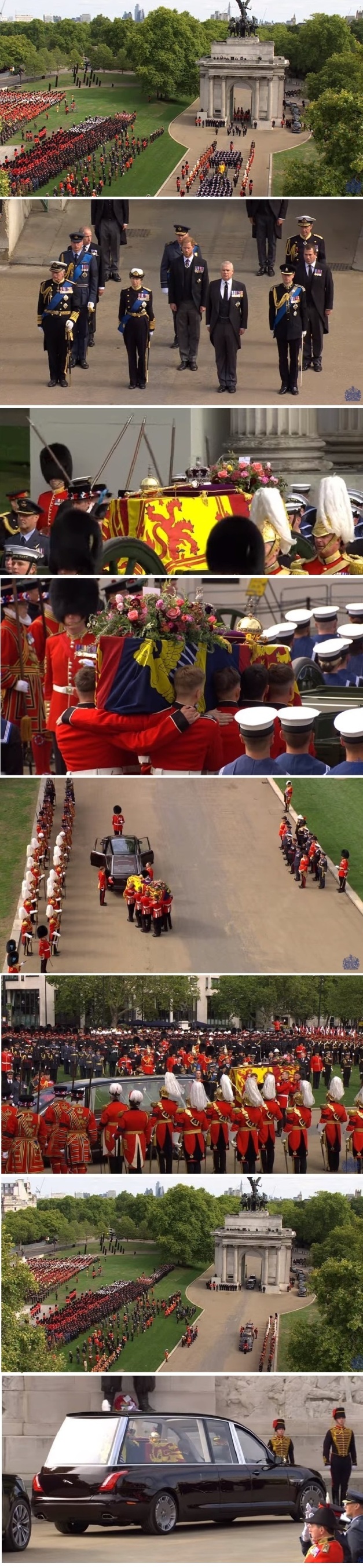Μια δημόσια πομπή έχει ξεκινήσει στις 12.15 μ.μ. καθώς το φέρετρο της Αυτής Μεγαλειότητος ταξιδεύει από το Αβαείο του Γουέστμινστερ με προορισμό την αψίδα του Ουέλινγκτον, δίπλα από το Χάιντ Παρκ και το παλάτι του Μπάκιγχαμ στο Λονδίνο.