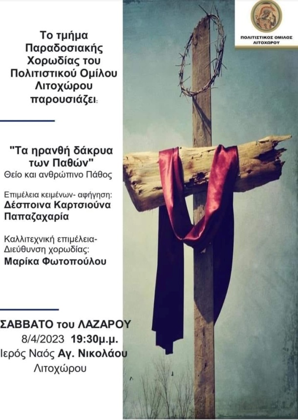 Το τμήμα Παραδοσιακής Χορωδίας του Πολιτιστικού Ομίλου Λιτοχώρου παρουσιάζει "Τα ηρανθή δάκρυα των Παθών. Θείο και ανθρώπινο Πάθος".