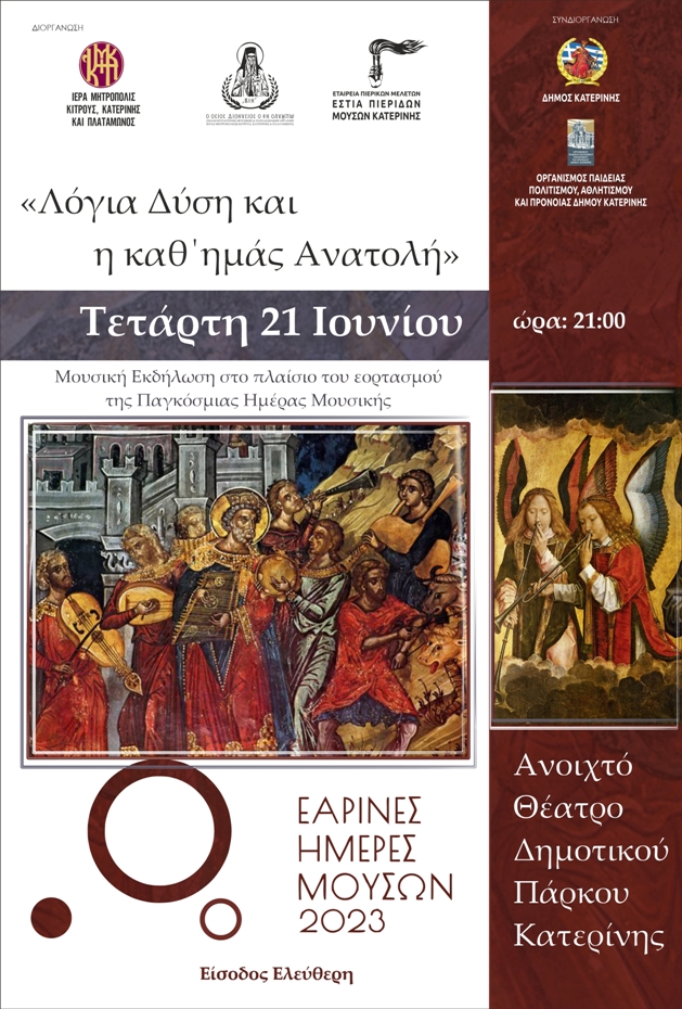 «Λόγια Δύση και η καθ΄ ημάς Ανατολή» τιτλοφορείται η Μουσική εκδήλωση στο πλαίσιο εορτασμού της παγκόσμιας ημέρας Μουσικής & των Εαρινών Ημερών Μουσών, την οποία διοργανώνουν η Μητρόπολη Κίτρους, Κατερίνης & Πλαταμώνος, η Σχολή Βυζαντινής και Παραδοσιακής Μουσικής της Ιεράς Μητροπόλεως «Όσιος Διονύσιος εν Ολύμπω» και η Εστία Πιερίδων Μουσών.