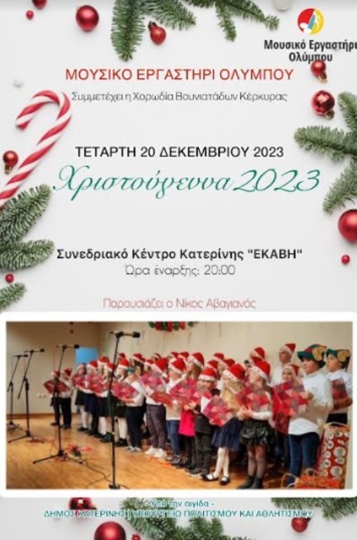 Το Μουσικό Εργαστήρι Ολύμπου σας προσκαλεί στην εορταστική εκδήλωση "Χριστούγεννα 2023", την Τετάρτη 20 Δεκεμβρίου 2023, στις 8 το βράδυ, στο Συνεδριακό Κέντρο Κατερίνης «Εκάβη», με τη συμμετοχή της Χορωδίας Βουνιατάδων Κέρκυρας.